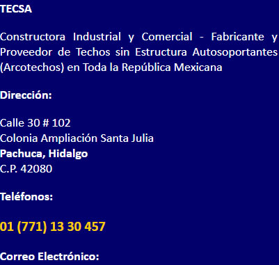 Para Ponerse en Contacto con TECSA, por favor marque al teléfono: 01 (771) 13 30 457 en la Ciudad de Pachuca, Hidalgo. ¡Estamos a sus Órdenes! Atendemos Toda la República Mexicana Correo Electrónico: ventas@techosmexico.com